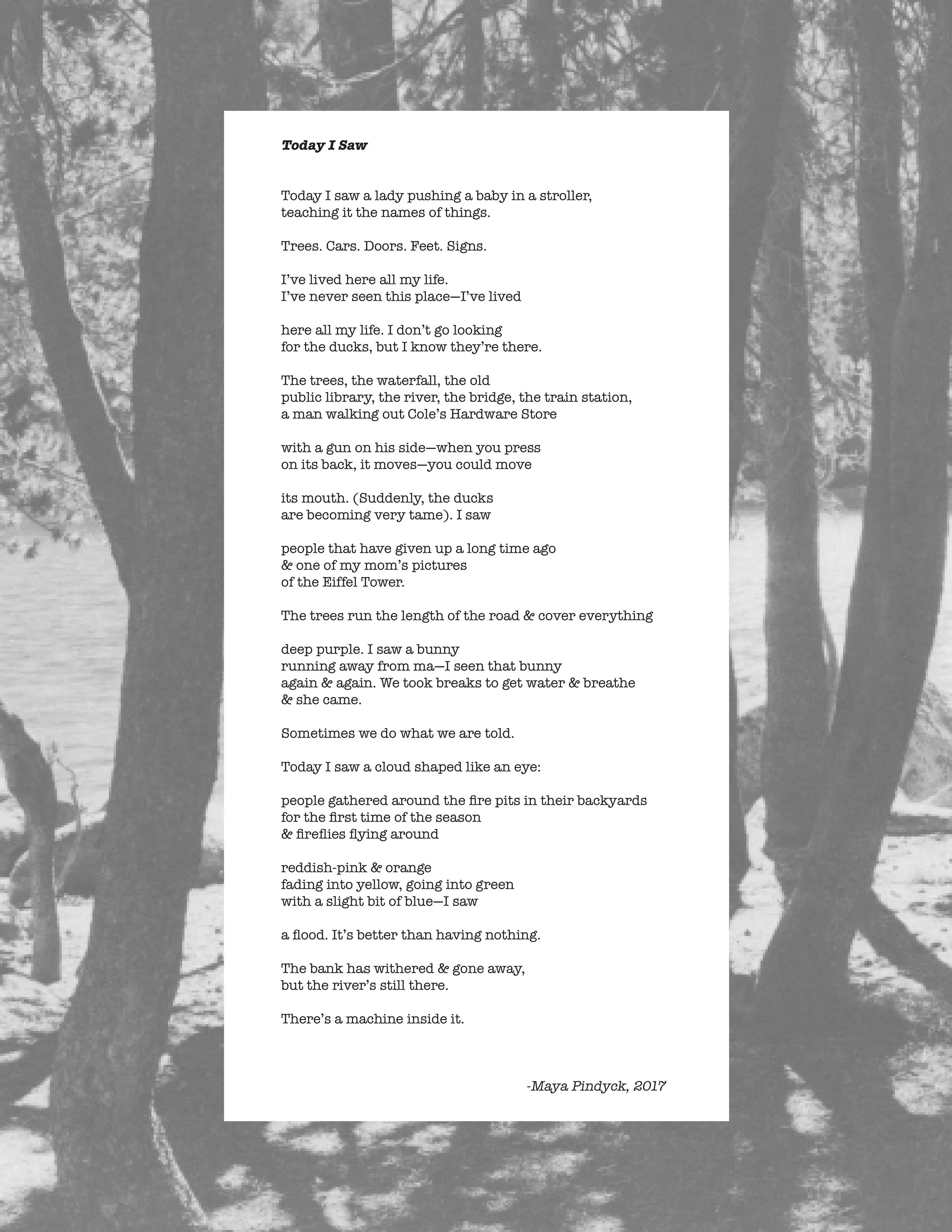 Maya Pindyck examines intimate intersections of memory, place, language, and the (in)visibility of bodies in cultural spaces. She is the author of Emoticoncert (Four Way Books, 2016), Friend Among Stones (New Rivers Press, 2009), and Locket, Master (Poetry Society of America Chapbook Fellowship, 2006). She exhibits her visual, sound, and text-based work widely. Her scholarship on creative practices, social justice and schooling has been published in a range of academic journals. In 2005, she co-founded an abortion story archive, Project Voice. Pindyck earned her PhD in English education from Columbia University's Teachers College, her MFA in poetry from Sarah Lawrence College, and her BA in studio art and philosophy from Connecticut College. She lives in Brooklyn and is an Assistant Professor of Liberal Arts/Writing and Director of Writing at Moore College of Art & Design in Philadelphia.